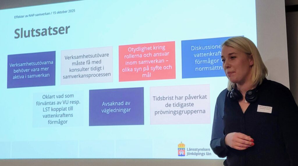 Förmiddagen inleddes med presentationer från Havs- och vattenmyndigheten, Vattenkraftens miljöfond, Länsstyrelsen i Jönköping, SVAF, Riksantikvarieämbetet – och Älvräddarna. Siri Lundströms keynote belyste miljöperspektivet i samverkansprocessen och betonade att Sverige har ett guldläge utan motstycke i Europa.